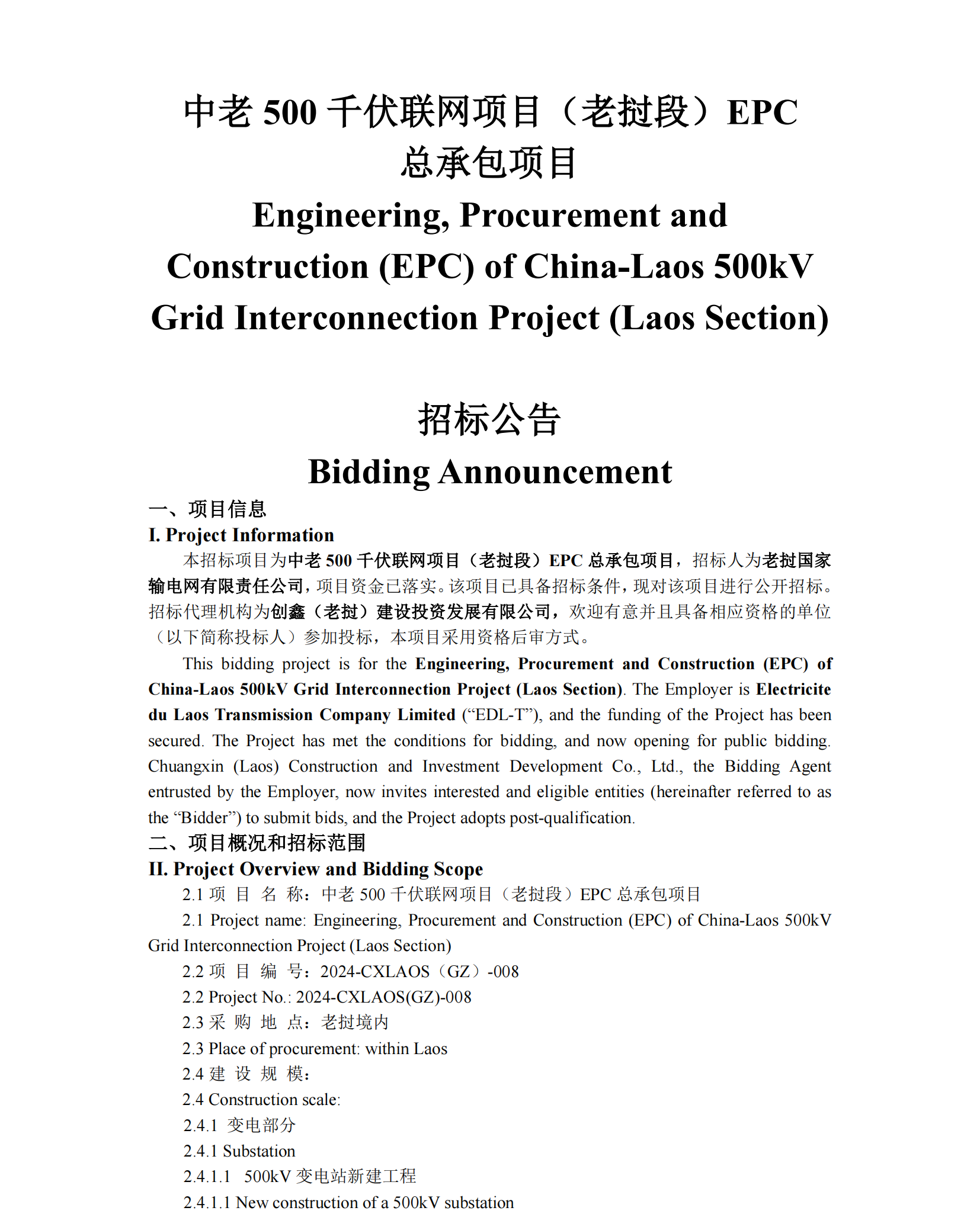 pdf完整版:(万象)(招标)中老500千伏联网项目(老挝段)EPC总承包项目招标公告.pdf