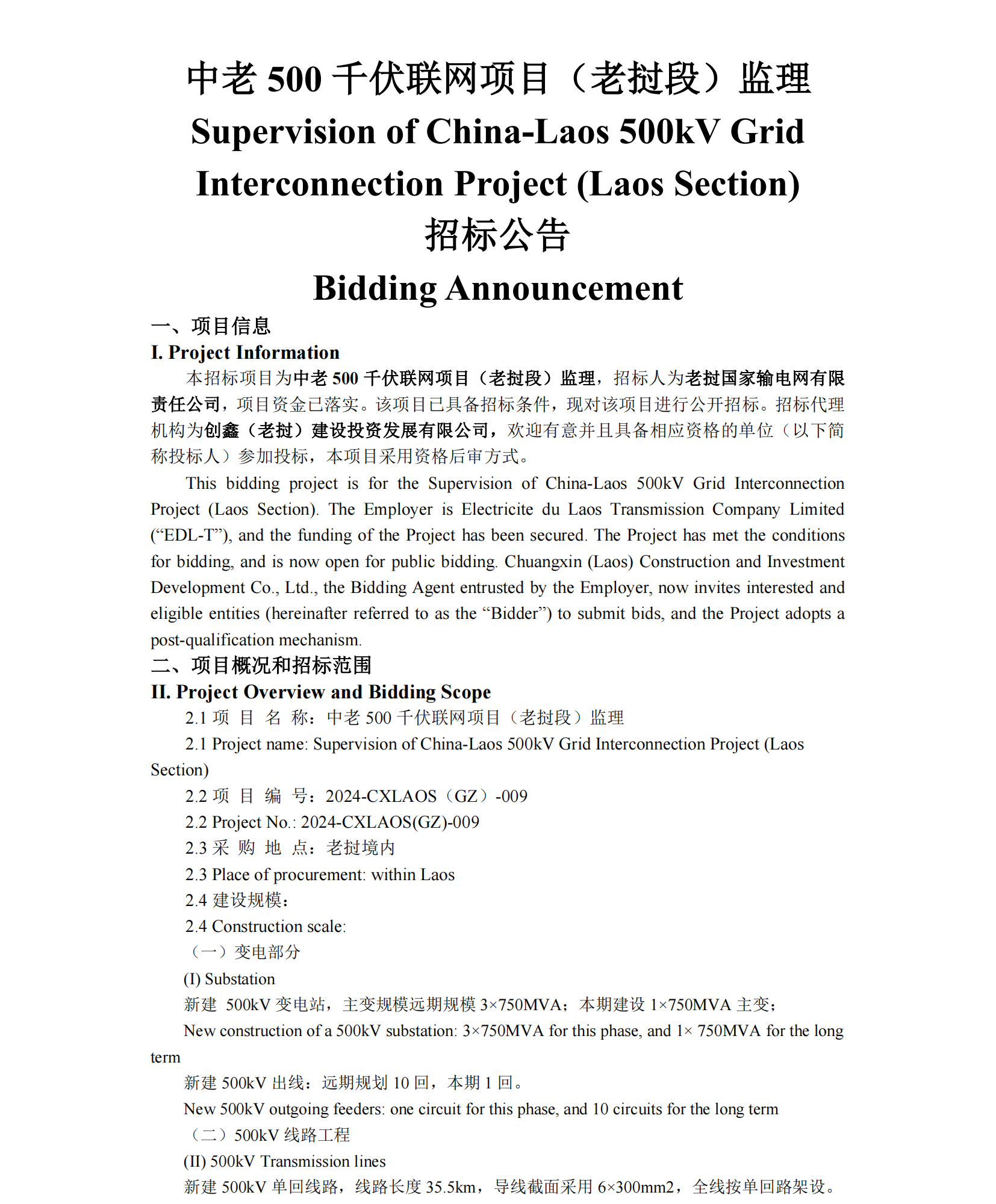 (万象)(招标)中老500千伏联网项目(老挝段)监理招标公告