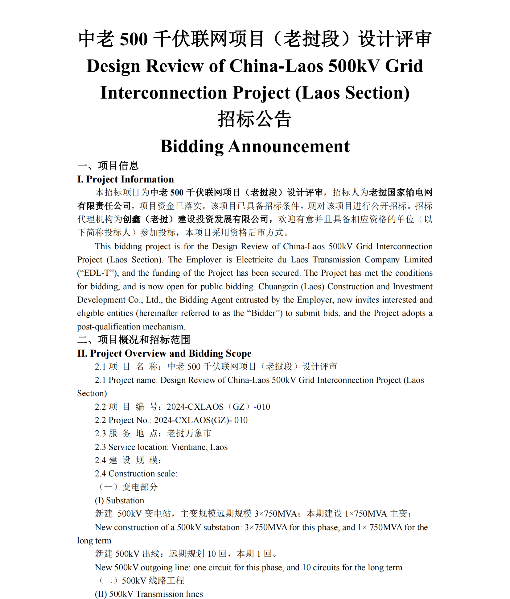 (万象)(招标)中老500千伏联网项目(老挝段)设计评审招标公告